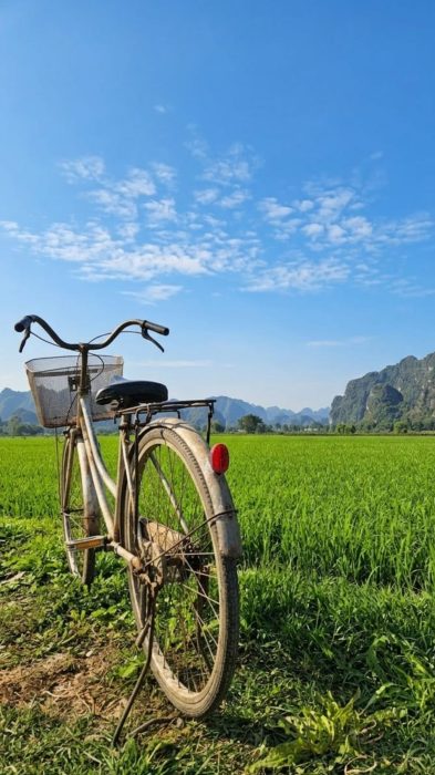 Uno de los mejores planes en Ninh Binh es simplemente recorrer los arrozales en bicicleta al atardecer y disfrutar del paisaje sin prisas. Después, nada mejor que relajarse en la piscina infinita del hotel mientras cae el sol.